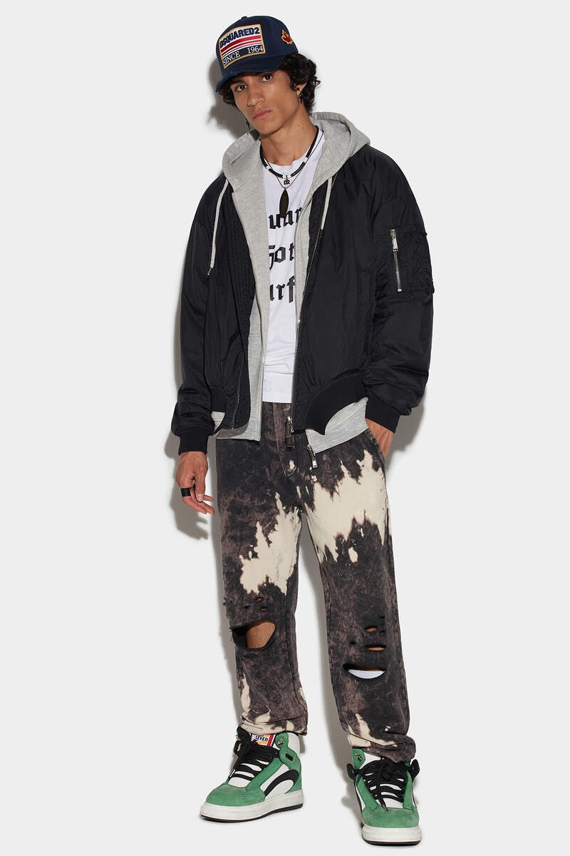 - PRODUCT ID: S74KB0731S25539961 - COTTON FLEECE TROUSERS - BAGGY FIT - TIE-DYE WASH - DESTROYED DETAILING - ELASTICATED WAISTBAND - SIDE POCKETS - RAW-CUT HEMS - REAR "DSQUARED2" PRINT - MADE IN ITALY PRIMARY FABRIC: 100% COTTON. SECONDARY FABRIC: 99% COTTON, 1% ELASTANE-SPANDEX. POCKET LINING: 100% COTTON These bold and rebellious monochrome chill out pants from Dsquared2 are sure to make a statement. The prominent holes and paint splashed give these trousers a gang-inspired aesthetic, while the "DSQUARED2" upside down print on the back adds a touch of edginess. The low-crotched and high-waisted design gives these trousers a trendy, contemporary vibe. Pair them with a graphic t-shirt and sneakers for an urban, effortlessly cool look.