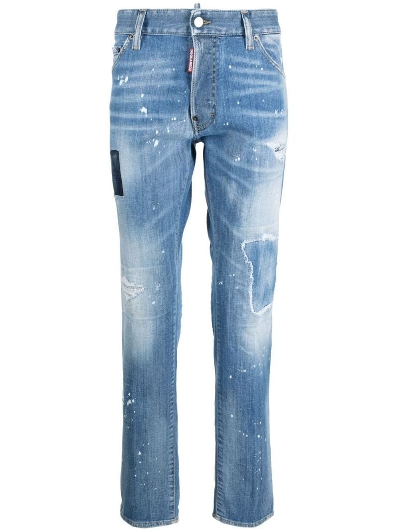 distressed mid-rise straight-leg jeans distressed mid-rise straight-leg jeans from DSQUARED2 featuring blue, cotton, distressed effect, paint splatter detail, mid-rise, button fly fastening, belt loops, classic five pockets and straight leg. Imported Composition Outer: Cotton 98%, Elastane 2% Lining: Polyester 65%, Cotton 35% SIZE & FIT Model measurements Height 6 ft 1 in(1.86 m) Bust/Chest 35.4 in(90 cm) Hips 34.6 in(88 cm) Waist 30.7 in(78 cm) FittingInformation This piece fits true to size. We recommend you get your regular size Designed for a slim fit at the waist and loose over the leg Made with a mid-weight fabric