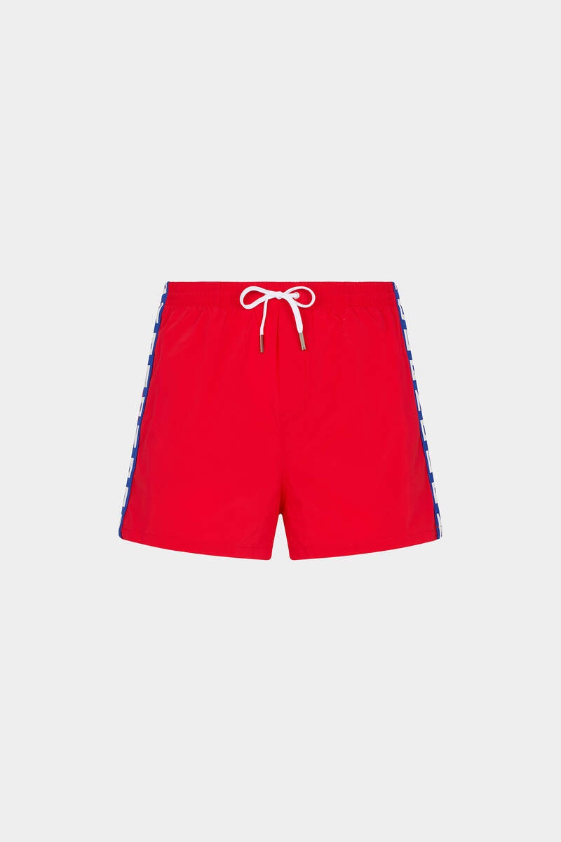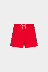 ● PRODUCT ID: D7B645540ISA01619 ● NYLON STRETCH SWIM TRUNKS ● LOGO TAPE SEWN ALONG THE SIDES ● ELASTICATED WAISTBAND WITH DRAWSTRING ● PULLER ON BACK ● INNER MICRO-MESH BRIEFS ● SLIM FIT ● MADE IN ITALY ● FABRIC: 92% NYLON, 8% ELASTANE It's the detail that makes the difference, even under the sun. These mid-thigh beach boxers come with two logoed ribbons sewn along the sides. They have an elasticated waist and drawstring with logoed metal end. The soft and comfortable fabric dries quickly.