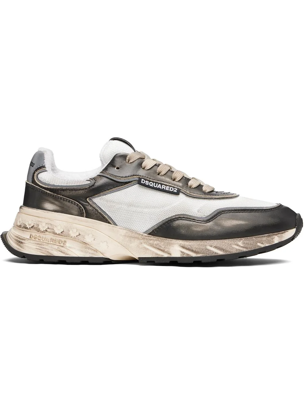 Low-top mesh and buffed calfskin sneakers. · Smudging and reflective trim throughout · Lace-up closure · Logo patch at padded tongue · Padded collar · Logo flag at outer side · Logo printed at heel tab · Terrycloth lining · Treaded rubber sole Supplier color: Black/Off white Upper: calfskin, textile. Sole: rubber. Made in Italy 252148M237024