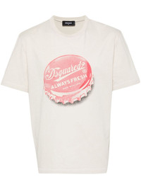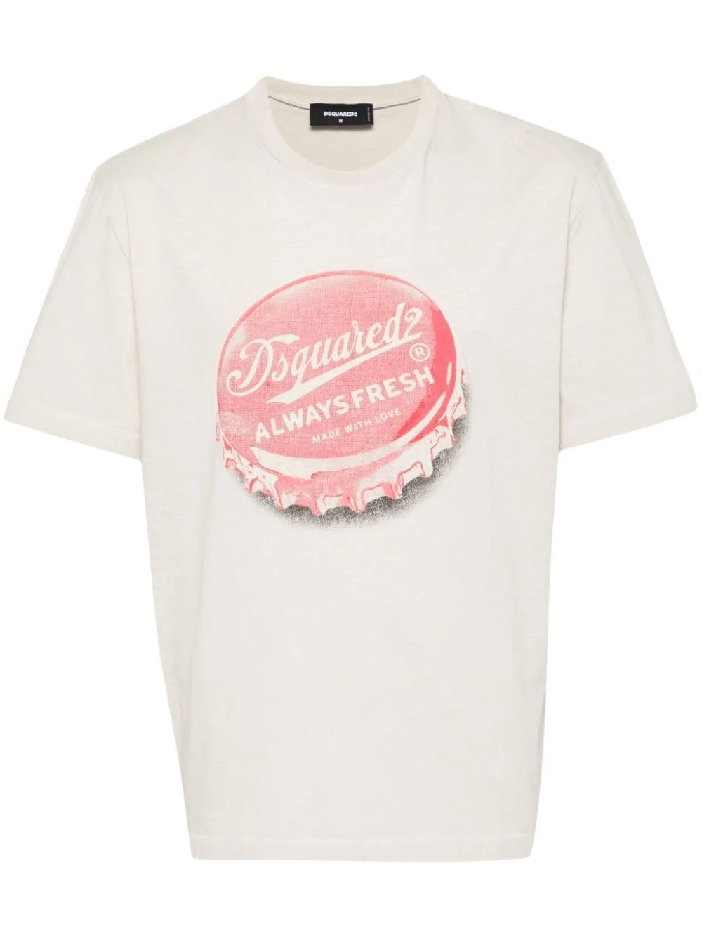graphic-print cotton T-shirt Dsquared2's playful style is shown in this beige T-shirt. Crafted from high-quality cotton, it features a straight cut that is accentuated by a unique 'Always Fresh' graphic print on the chest, adding a distinctive touch to the overall design. Highlights - Beige - Cotton - Jersey texture - Ribbed crew neck - Short sleeves - Graphic print to the front - Straight hem Made in Italy Composition Cotton 100% SIZE & FIT Model measurements Height 6 ft 2 in(1.87 m) Bust/Chest 37 in(94 cm) Hips 33.85 in(86 cm) Waist 27.95 in(71 cm) FittingInformation Designed for a relaxed fit, this piece allows for comfort and movement when worn Made from a midweight non-stretch fabric, this piece offers minimal elasticity when worn This piece fits true to size – take your usual size Washing instructions Machine Wash