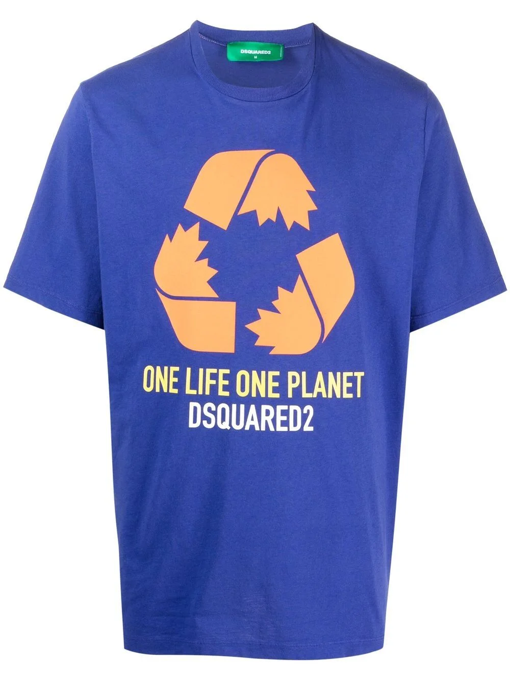 graphic-print T-shirt DSQUARED2's T-shirt is emblazoned with an oversized motif at the chest depicting the recycling symbol - notice the updated design featuring the brand's maple leaf logo. Made in Italy Composition Cotton 100% SIZE & FIT Model measurements Height 6 ft 2 in(1.87 m) Bust/Chest 36.41 in(92.5 cm) Hips 37 in(94 cm) Waist 29.52 in(75 cm) FittingInformation This piece fits true to size. We recommend you get your regular size Cut for a loose fit Made with a mid-weight fabric Washing instructions Machine Wash