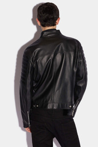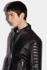 - PRODUCT ID: S78AN0045SY1491900 - LEATHER BIKER JACKET - SLIM FIT - MANDARIN COLLAR WITH SNAP BUTTON CLOSURE - ZIP WELT POCKETS - ZIP CUFFS - TWO-WAY ZIP CLOSURE - MADE IN INDIA PRIMARY FABRIC: 100% SHEEPSKIN LEATHER. POCKET LINING: 100% COTTON. LINING: 100% POLYESTER. SLEEVE LINING: 100% POLYESTER The model is 6'2" tall and wears a size 38 Opt for the rocker look in this black zip-front biker jacket bomber. The jacket follows the classic biker style with zipped pockets and padded details on the arms. Pair with a pair of skinny stonewashed blue jeans for that rebellious yet resolutely urbane vibe.