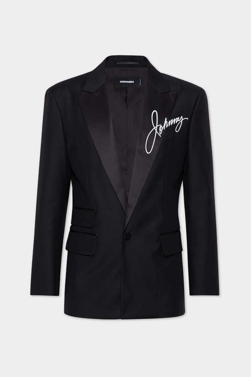 - MADE FROM A WOOL AND SILK BLEND - PEAK LAPELS - SINGLE-BREASTED - FLAP POCKETS - "JOHNNY" PRINT PRIMARY FABRIC: 65% VIRGIN WOOL, 35% SILK; SECONDARY FABRIC: 100% SILK; LINING: 100% POLYESTER; SLEEVE LINING: 60% VISCOSE-RAYON, 40% POLYESTER; POCKET LINING: 100% COTTON Look sharp in this refined wool-silk dinner jacket, flaunting a dapper silhouette with Johnny lettering printed on the chest. Styled with peak lapels, a single button closure and three flap pockets for timeless black-tie elegance.