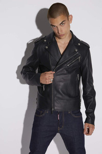 - PRODUCT ID: S74AM1250SY1491900 - BIKER JACKET IN COWHIDE - SLIM FIT - CLASSIC LAPELS - DOUBLE BREASTED WITH TWO-WAY ZIP - MILITARY-STYLE PATCHES ON SHOULDER - SMALL WELT POCKET WITH ZIP ON THE CHEST - WELT POCKETS WITH ZIP ON THE SIDES - CUFFS WITH ZIP - SMALL BELTS WITH METAL BUCKLES ON BACK - MADE IN ITALY MAIN FABRIC: 100% LEATHER. LINING: POCKETS: 100% COTTON. LINING: 100% POLYESTER. The model is 6'2" tall and wears a size 38 Channel the heart throb aesthetic in the Kiodo jacket, a classic design with a contemporary twist. Features all the hallmarks of a classic biker jacket design, reworked in a slightly oversized fit. Pair with a plain white tee, loose fit jeans and black boots for a 1950s pin-up look.
