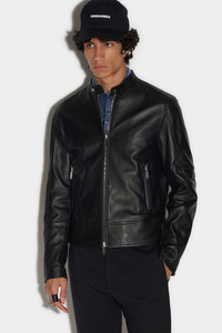 - PRODUCT ID: S74AM1328SY1491900 - LEATHER BIKER JACKET - SLIM FIT - TWO-WAY ZIP CLOSURE - MANDARIN COLLAR WITH SNAP BUTTON CLOSURE - SIDE ZIP POCKETS - ZIP CUFFS - SIDE BUCKLE STRAPS - MADE IN INDIA PRIMARY FABRIC: 100% SHEEPSKIN LEATHER. POCKET LINING: 100% COTTON. BODY LINING: 100% POLYESTER. Make a statement with the Dsquared2 men's leather bomber jacket. This biker-inspired piece features a front zip closure and vertical side zips, as well as a wide waistband on the hemline. The premium leather material adds a luxurious touch to this edgy jacket. Whether you're heading out for a night on the town or simply want to add some attitude to your everyday look, this jacket is sure to turn heads. Pair it with dark wash jeans and boots for a rebellious ensemble.