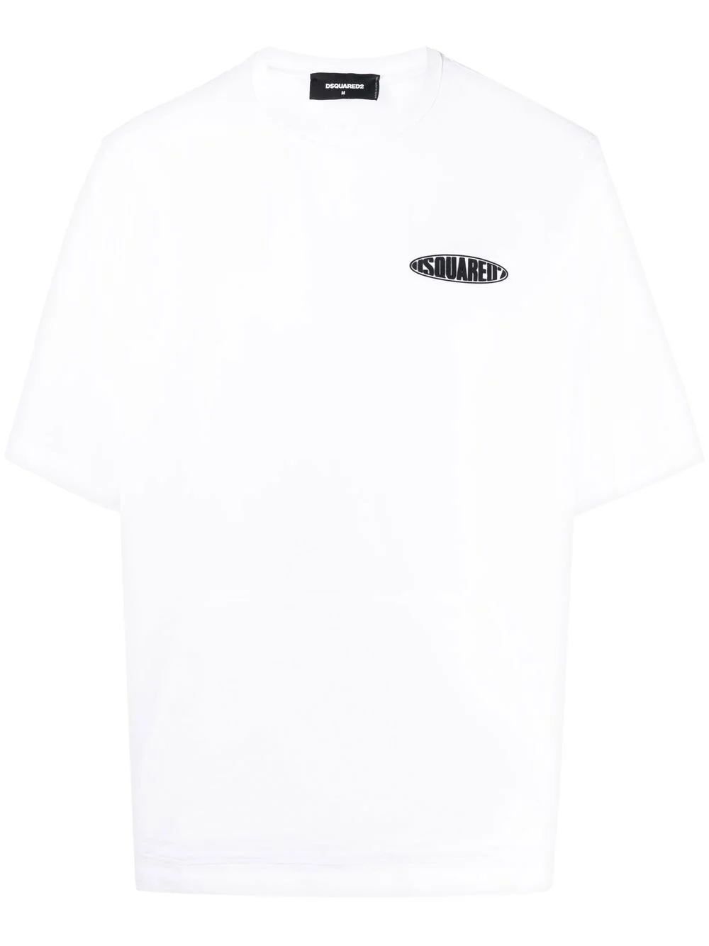 logo-print cotton T-shirt white cotton logo print at the chest crew neck short sleeves straight hem Imported Composition Cotton 100% SIZE & FIT Model measurements Height 6 ft 2 in(1.87 m) Bust/Chest 35.82 in(91 cm) Hips 35.43 in(90 cm) Waist 27.95 in(71 cm) FittingInformation This piece fits true to size. We recommend you get your regular size Cut for a loose fit Made with a mid-weight fabric Washing instructions Machine Wash