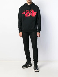 logo print hoodie As well as presenting a collection of quirky styles and standout silhouettes, the Caten twin designers behind DSQUARED2 prove that they are also expert in fashioning timeless wardrobe staples. This black and red logo print hoodie is crafted from cotton and features a hood with drawstring tie fastenings, long sleeves, a relaxed fit, a central printed logo and a ribbed hem and cuffs. Imported Composition Cotton 100% SIZE & FIT Model measurements Height 6 ft 1 in(1.86 m) Bust/Chest 37.4 in(95 cm) Hips 37.4 in(95 cm) Waist 29.92 in(76 cm) FittingInformation This piece fits true to size. We recommend you get your regular size Cut for a relaxed fit Made with a mid-weight fabric Washing instructions Hand Wash