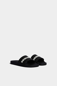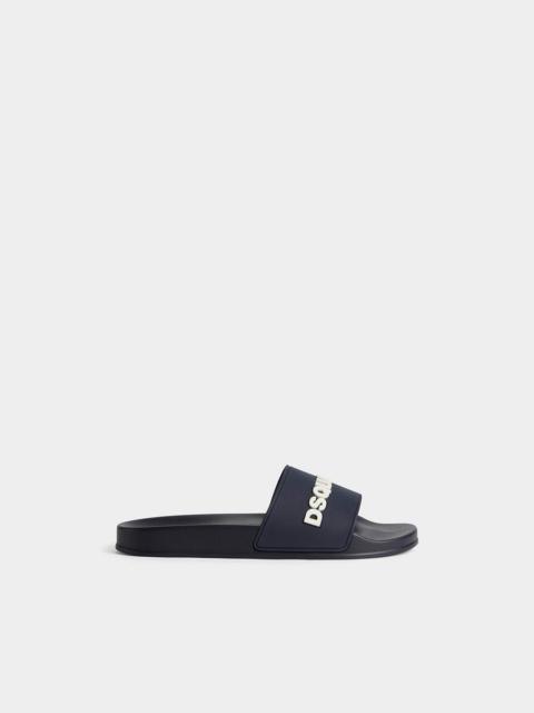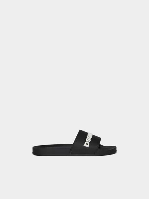 - PRODUCT ID: FFM0023172050132124 - RUBBER SLIDE SANDALS - 3D "DSQUARED2” LETTERING - ANATOMICAL SOLE - MADE IN ITALY UPPER: 100% POLYURETHANE. SOLE: 100% EVA Treat yourself to a new eye-catching pair of footwear with the Dsquared2 Logo Slides. These block-colour slides feature a raised “DSQUARED2” logo on the front, elevating them from a simple wardrobe staple. These practical yet fun shoes are easy to slip on and look great paired with distressed jeans and chunky socks for a laidback look.