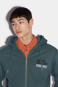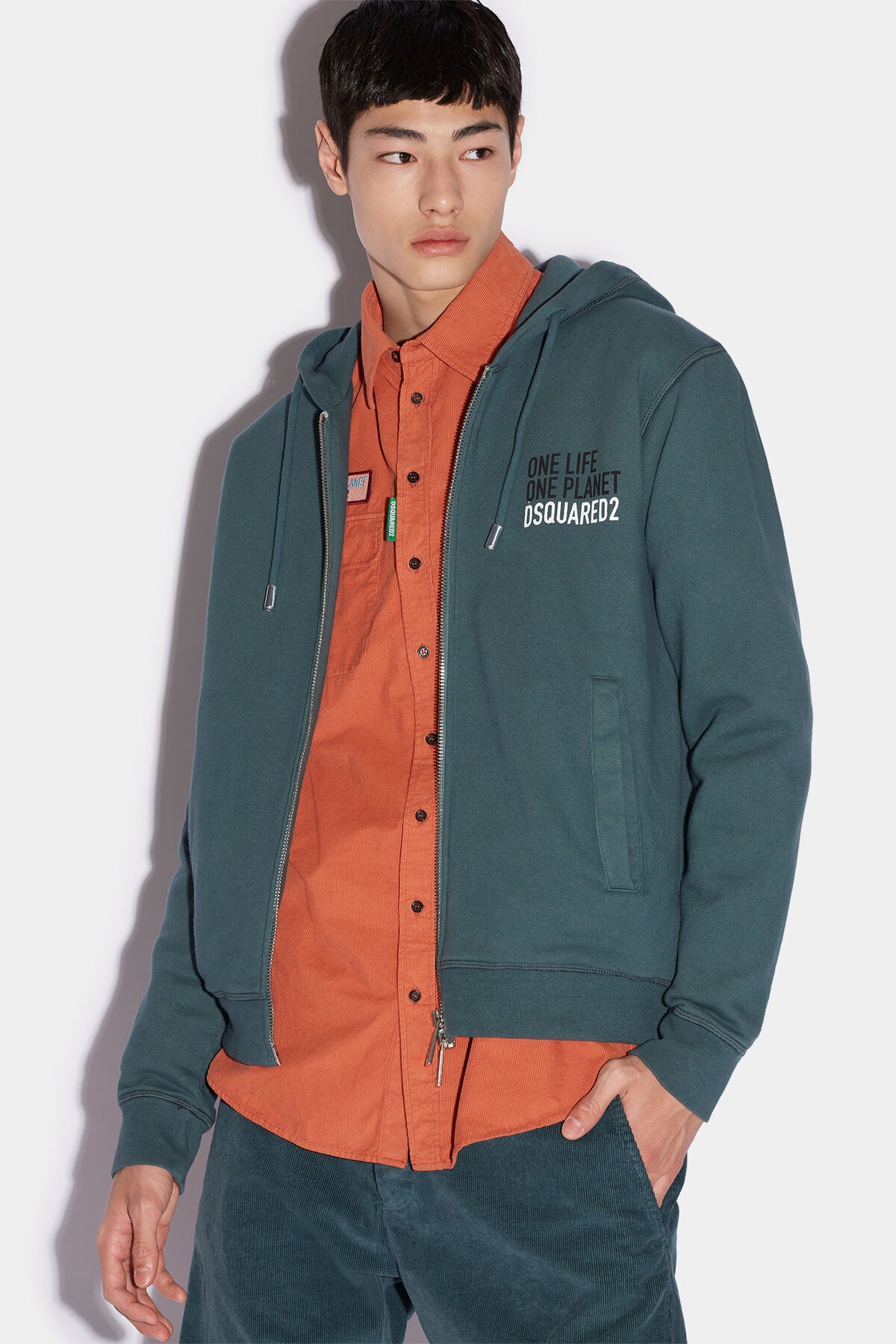 - PRODUCT ID: S78GU0065S25568610 - RECYCLED ORGANIC COTTON SWEATSHIRT - REGULAR FIT - DRAWSTRING HOOD - SIDE WELT POCKETS - TWO-WAY ZIP CLOSURE - "ONE LIFE ONE PLANET DSQUARED2" PRINT ON THE CHEST - MADE IN ITALY PRIMARY FABRIC: 100% COTTON SECONDARY FABRIC: 96% COTTON 4% ELASTANE-SPANDEX SECONDARY FABRIC: 94% COTTON 6% ELASTANE-SPANDEX POCKET LINING: 100% COTTON THE MODEL IS 6'2" TALL AND WEARS A SIZE M WORK THE HIPPY CHIC VIBE IN THIS LONG-SLEEVED SWEAT JACKET WITH A DISCREET LOGO DETAIL. FEATURES A PLAIN-DYE BACKGROUND WITH A TEXT ONE PLANET LOGO AND GREEN DSQUARED2 TAB. PAIR WITH PAINT-SPLATTERED JEANS AND A BEANIE TO FINISH THE LOOK. AVAILABLE IN TWO COLOURS.