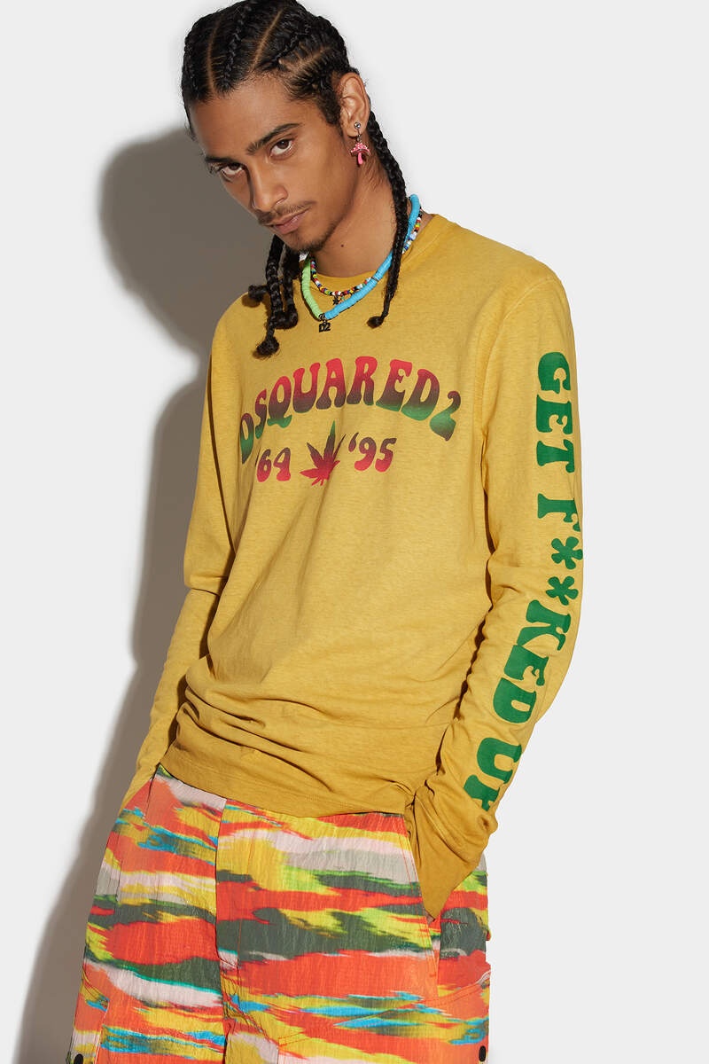 - PRODUCT ID: S71GD1257S22507245 - COTTON JERSEY CREW-NECK T-SHIRT - REGULAR FIT - PRINTED LETTERING ON THE SLEEVES - GRAPHIC "DSQUARED2" PRINT - MADE IN ITALY 100% COTTON Work the retro look in this Dsquared2 oversized long-sleeved Surf T-shirt. Worked in soft, marl fabric with a subtle gradient effect, it features a crew neck and Dsquared2 Rasta-inspired Cannabis leaf logo on the front with seriously cheeky slogans down the arms. Perfect for casual days or nights out. Pair with this season's joggers or tie dye shorts and a bucket cap for cool, retro vibes.