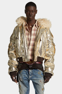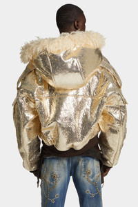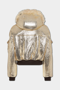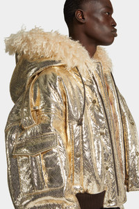 - PRODUCT ID : S71AN0616D35361906 - MADE FROM METALLIC FAUX LEATHER - ZIP CLOSURE - BUTTONED STORM FLAP - DRAWSTRING HOOD WITH FAUX FUR TRIM - BUTTONED POCKETS - SLEEVE POCKETS - RIBBED CUFFS AND HEM PRIMARY FABRIC: 89% POLYAMIDE-NYLON, 11% POLYESTER; COATING: 100% POLYURETHANE; SECONDARY FABRIC: 100% POLYESTER, LINING: 100% POLYESTER; POCKET LINING: 100% COTTON Urban icon meets disco queen with this statement take on the classic hooded bomber, built from metallic faux leather with a gloriously tactile furry trim. Complete with roomy pockets to keep your essentials close.