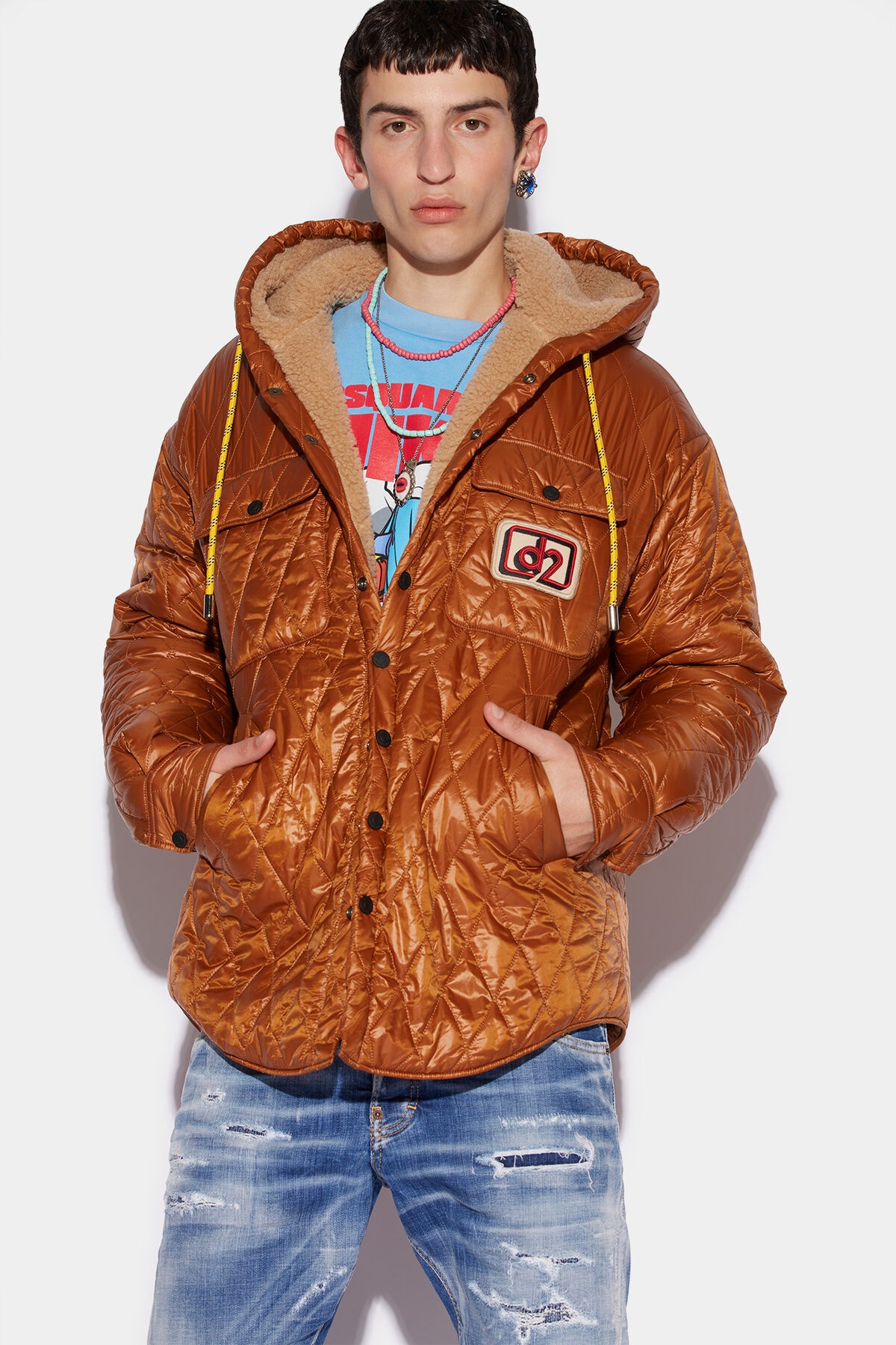 - PRODUCT ID: S71DM0574S60389137 - NYLON OVERSHIRT WITH RHOMBUS QUILTING - REGULAR FIT - DRAWSTRING HOOD - BUTTONED FLAP CHEST POCKETS - SIDE WELT POCKETS - SNAP BUTTON CUFFS - SNAP BUTTON CLOSURE - EMBROIDERED "D2" PATCH ON THE CHEST - TEDDY LINING - MADE IN ITALY PRIMARY FABRIC 100% POLYAMIDE-NYLON PADDING 100% POLYESTER LINING 71% POLYESTER 29% ACRYLIC POCKET LINING 100% COTTON THE MODEL IS 6'2" TALL AND WEARS A SIZE 38 AS THE WEATHER GROWS COLDER, WRAP UP WARM WITH THE QUILTED HOODED JACKET. THIS JACKET BY DSQUARED2 IS CRAFTED FROM A QUILTED FABRIC WITH A METALLIC SHEEN FOR A TWIST ON A MODERN CLASSIC – PERFECT FOR KEEPING YOU SNUG WHILE LOOKING COOL. LAYER IT OVER A GRAPHIC TEE FOR A QUIRKY CASUAL OUTFIT.