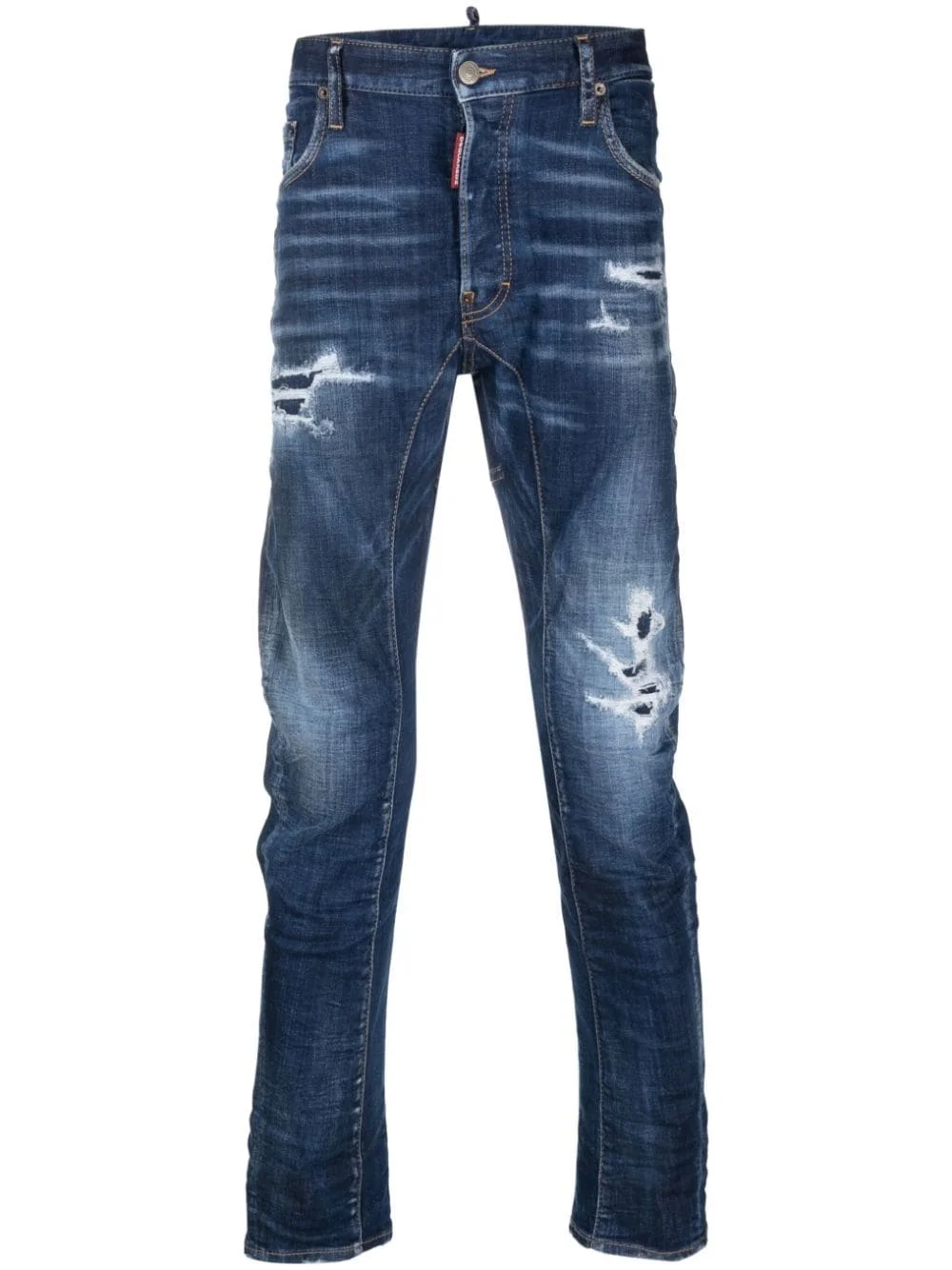 ripped slim-fit jeans Highlights - Dark blue - Stretch-cotton - Denim - Ripped detailing - Distressed effect - Stonewashed - Belt loops - Front button and zip fastening - Slim cut - Classic five pockets Made in Italy Composition Cotton 98%, Elastane 2% SIZE & FIT Model measurements Height 6 ft 2 in(1.87 m) Bust/Chest 36.22 in(92 cm) Hips 37 in(94 cm) Waist 27.95 in(71 cm) FittingInformation Designed for a slim tapered leg, these jeans offer a close fit that sits just away from the leg with a closer fit towards the ankle Constructed from stretch denim, this piece offers a stretch fit with durability This piece fits true to size – take your usual size Washing instructions Machine Wash