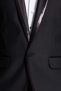 - PRODUCT ID : S74BN1337S39408900 - MADE FROM WOOL-SILK - SEQUIN TRIMS - SINGLE-BREASTED - SHAWL LAPELS - CHEST WELT POCKET - FLAP POCKETS - BUTTONED CUFFS PRIMARY FABRIC: 65% VIRGIN WOOL, 35% SILK; SECONDARY FABRIC: 100% SILK; LINING: 100% POLYESTER; SLEEVE LINING: 60% VISCOSE-RAYON, 40% POLYESTER; POCKET LINING: 100% COTTON Black-tie glamour at its finest. This silk-wool jacket elevates the evening icon with glistening sequin trims. Styled with a shawl collar and single-button closure.