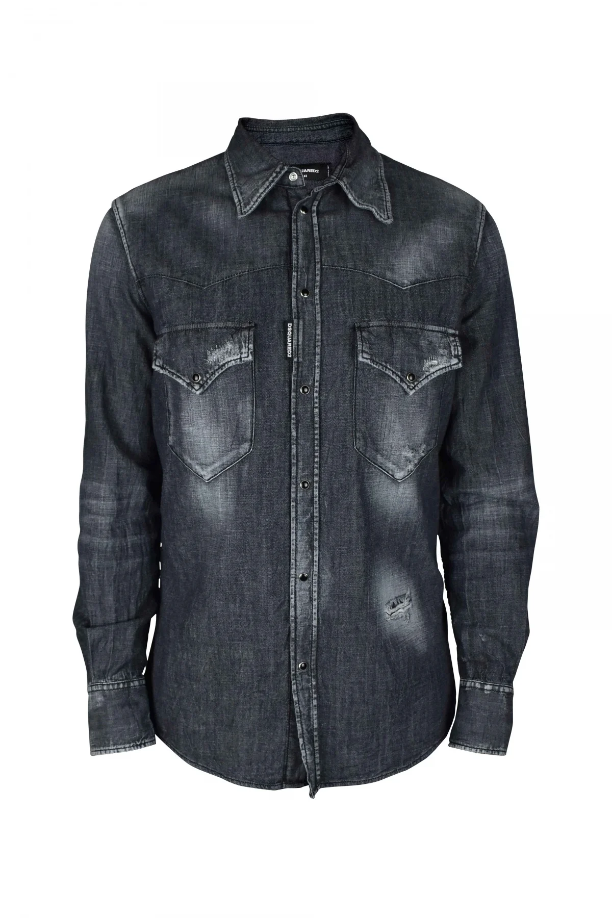 Black cotton denim New Western shirt by Dsquared2. Washed and distressed effect. Standard fit. Classic collar. Chest pockets with black snap flap. Black snap closure and cuffs. Long sleeves. Black logo label at front. Made in Italy.