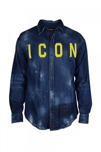 Blue denim shirt from Dsquared2. Printed "Icon" at the front in neon yellow. Classic collar, button closure, button cuffs. Aged effect. Soft stretch cotton. Cotton: 98%, elastane: 2%. Made in Italy.