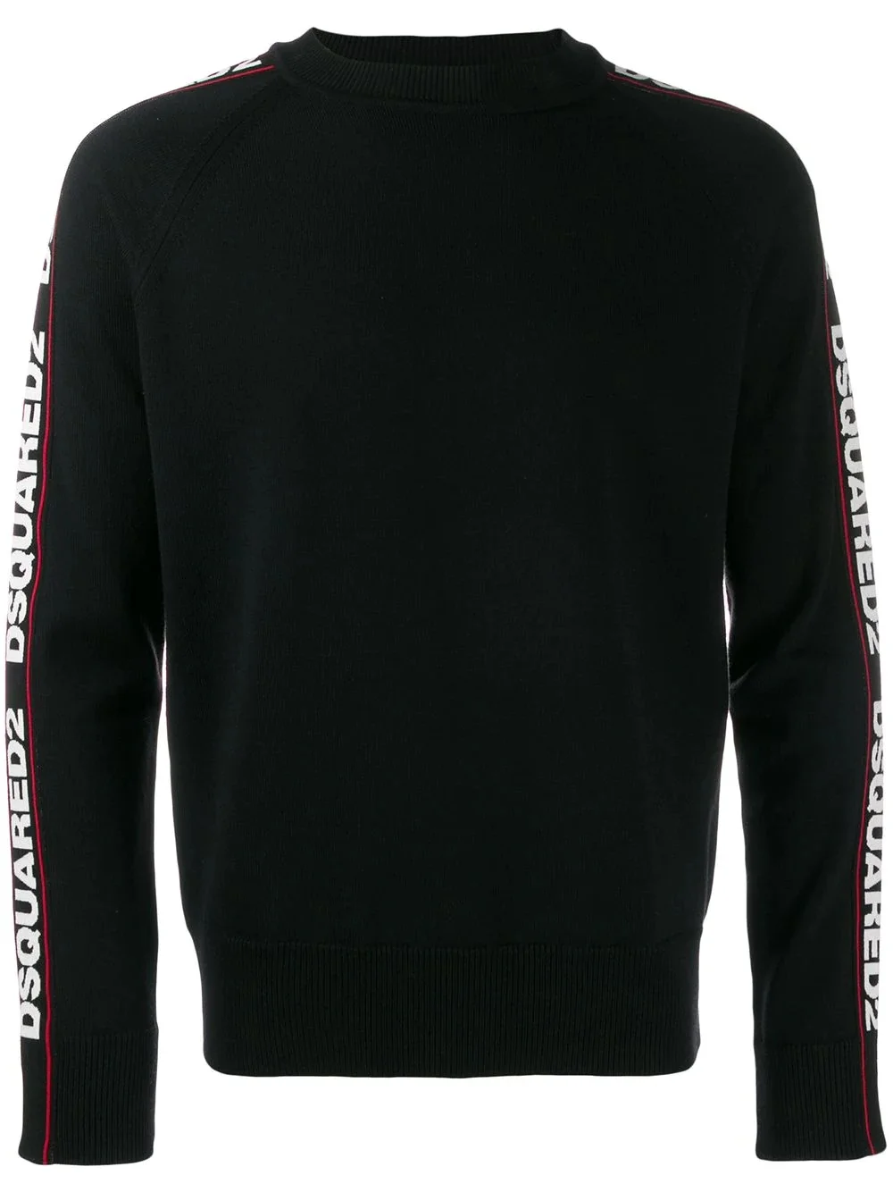 side logo band jumper DSQUARED2 combine expert Italian craftsmanship with their penchant for menswear tailoring to provide a collection of wardrobe essentials for the modern gentleman, as showcased by this black wool blend side logo band jumper. Featuring a ribbed crew neck, long sleeves and a ribbed hem and cuffs. Made in Italy Composition Wool 87%, Viscose 10%, Polyester 3% SIZE & FIT Model measurements Height 6 ft 2 in(1.89 m) Bust/Chest 36.22 in(92 cm) Hips 35.82 in(91 cm) Waist 28.74 in(73 cm) FittingInformation This piece fits true to size. We recommend you get your regular size Cut for a relaxed fit Made with a mid-weight fabric Washing instructions Dry Clean Only