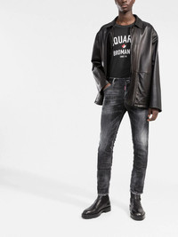 slim-fit straight-leg jeans These DSquared2 jeans are cut for a contemporary slim fit, and accented with the brand's signature distressed effect. A faded finish and subtle rips present an understated take on the brand's rebellious aesthetic. Made in Italy Composition Outer: Cotton 98%, Leather 80%, Polyester 14%, Latex 6%, Elastane 2% Lining: Polyester 65%, Cotton 35% SIZE & FIT Model measurements Height 5 ft 9 in(1.76 m) FittingInformation This piece fits true to size. We recommend you get your regular size Cut for a slim fit Made with a mid-weight stretch fabric
