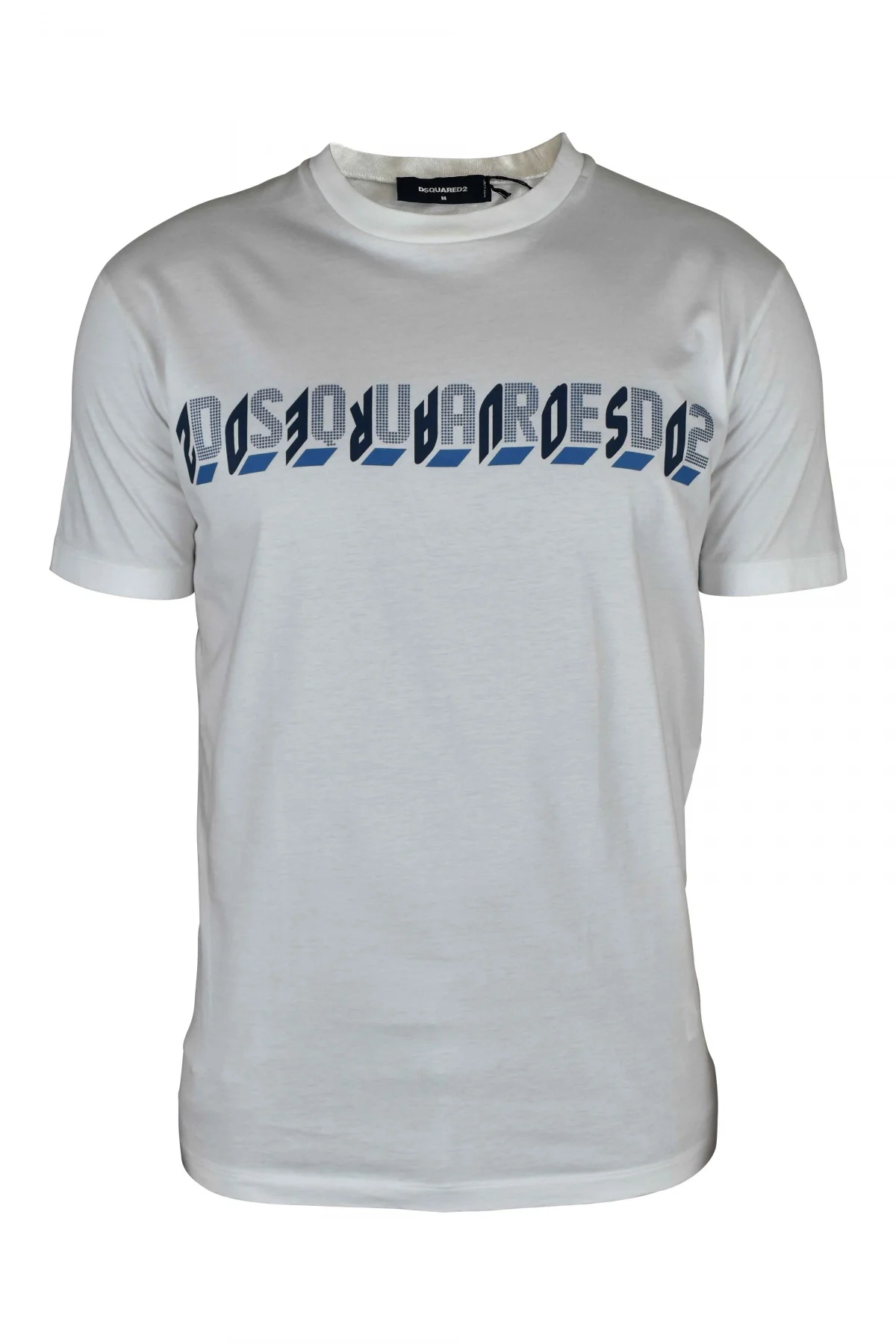 White T-shirt Dsquared2. Round neck. Printed logo in blue 3D effect and mirror in the center. Short sleeves. 100% cotton. Made in Italy.