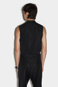 - PRODUCT ID: S74FB0306S39408900 - WOOL AND SILK WAISTCOAT - SLIM FIT - MANDARIN COLLAR - BUTTON CLOSURE - SIDE WELT POCKETS - REAR STRAP - MADE IN ITALY PRIMARY FABRIC: 65% VIRGIN WOOL, 35% SILK. POCKET LINING: 100% POLYESTER The Dsquared2 men's black tuxedo vest is a versatile piece that's perfect for any stylish man's wardrobe. This slim-fit vest features distinctive raw cut armholes and a long front hem, adding a touch of modernity to a classic design. Pair it with a crisp white shirt, jeans, and sneakers for a casual yet sophisticated look, or wear it over a suit jacket for a more formal vibe. This versatile vest is sure to make a bold statement no matter what the occasion.