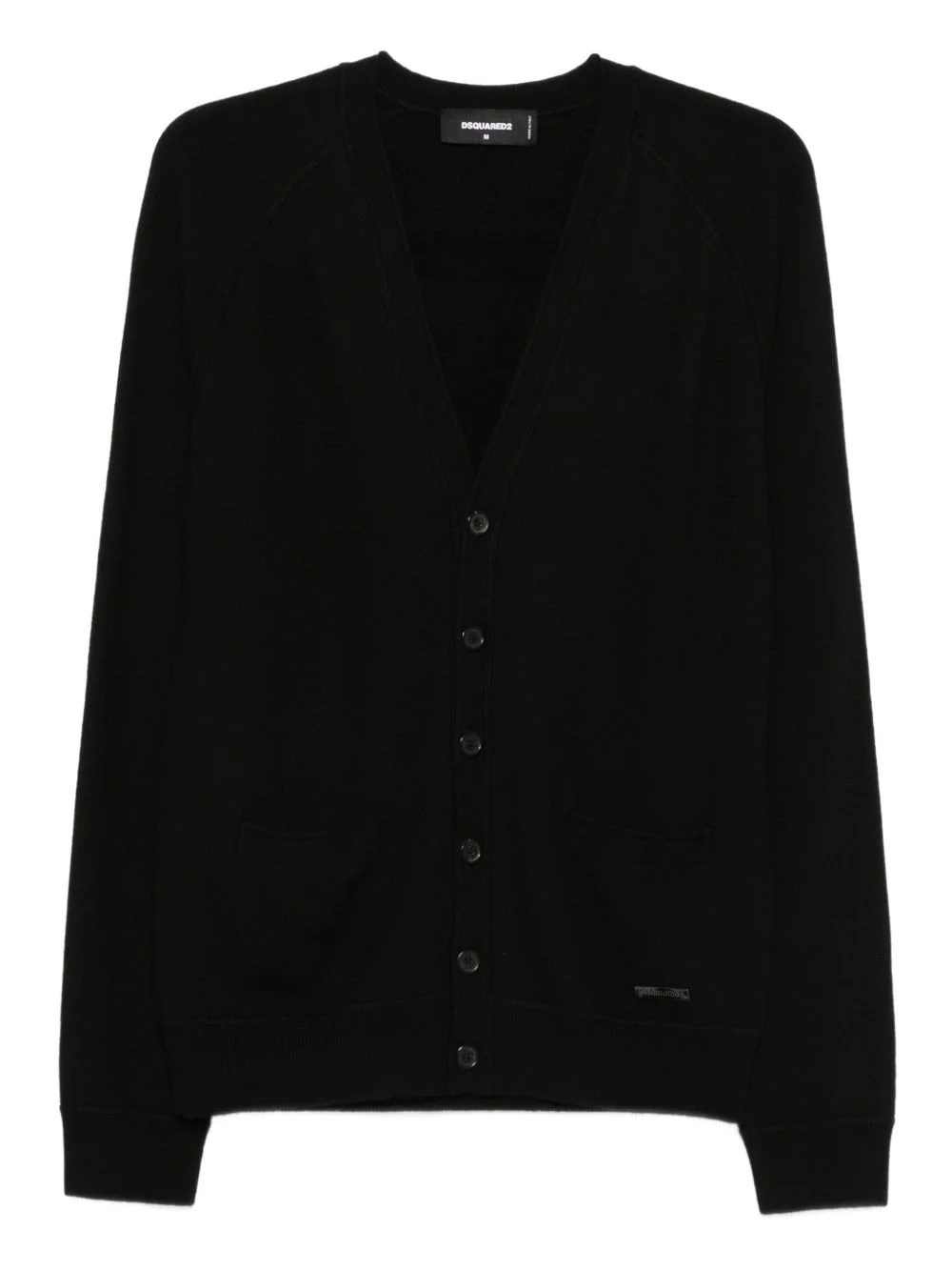 V-neck buttoned cardigan Highlights - Black - V-neck - Button fastening - Raglan sleeves - Patch pockets - Logo label Made in Italy Composition Wool 100% Washing instructions Read Manufacturer Guidelines