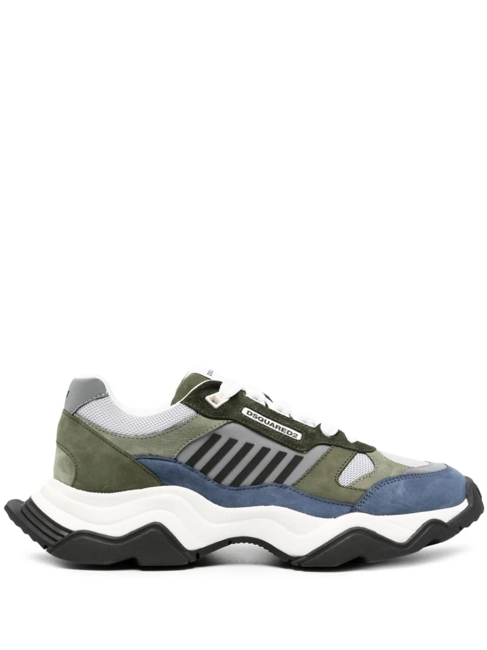 Wave low-top sneakers Highlights - Light grey/sky blue/dark green - Leather trim - Panelled design - Logo print to the side - Logo patch at the tongue - Round toe - Front lace-up fastening - Branded insole - Ridged rubber sole Made in Italy Composition Outer: Calf Leather 50%, Polyester 50% Lining: Fabric 100% Sole: Rubber 100% SIZE & FIT Measurement HEEL 1.77 in(4.5 cm) Sole height 0.78 in(2 cm)