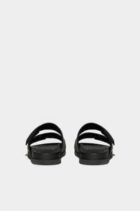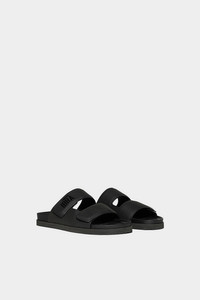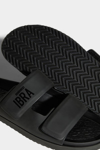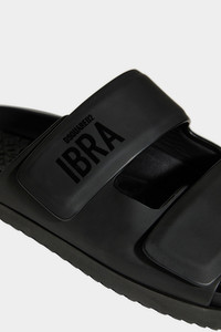 - PRODUCT ID: FSM005230805742M2181 - RUBBERISED LEATHER FUSSBETT SANDALS - SHINY "DSQUARED2 IBRA" PRINT - "DSQUARED2" LETTERING ON THE SOLE - VELCRO STRAPS - MADE IN ITALY UPPER: 100% LEATHER. LINING: 100% LEATHER. SOLE: 100% ELASTODIENE Relax in style in this pair of premium Ibra Black on Black sandals. Made of rubberised leather, it features a shiny 'DSQUARED2' print on the Velcro strap. Perfect for lounge wear or paired with contrasting socks for casual strolls.