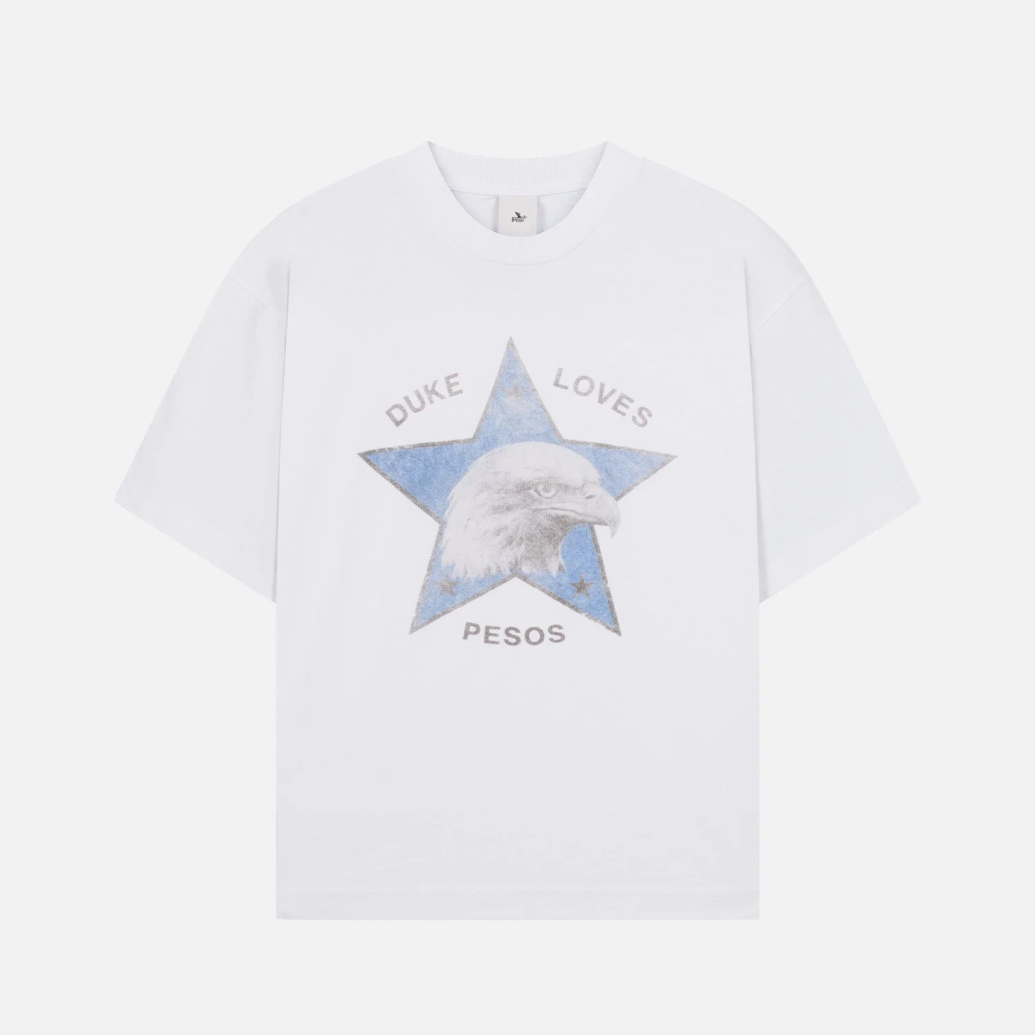Our Veteran T-Shirt is printed with an eagle, a star and ‘Duke Loves Pesos’ at the chest. It’s cut for a relaxed fit from white cotton-jersey and is washed-out to feel like one you’ve had for years. SPECIFICATIONS Fit Relaxed Composition 100% Cotton Detail Washed-out for a lived in look. Printed design Packaging All our packaging is made from recycled materials