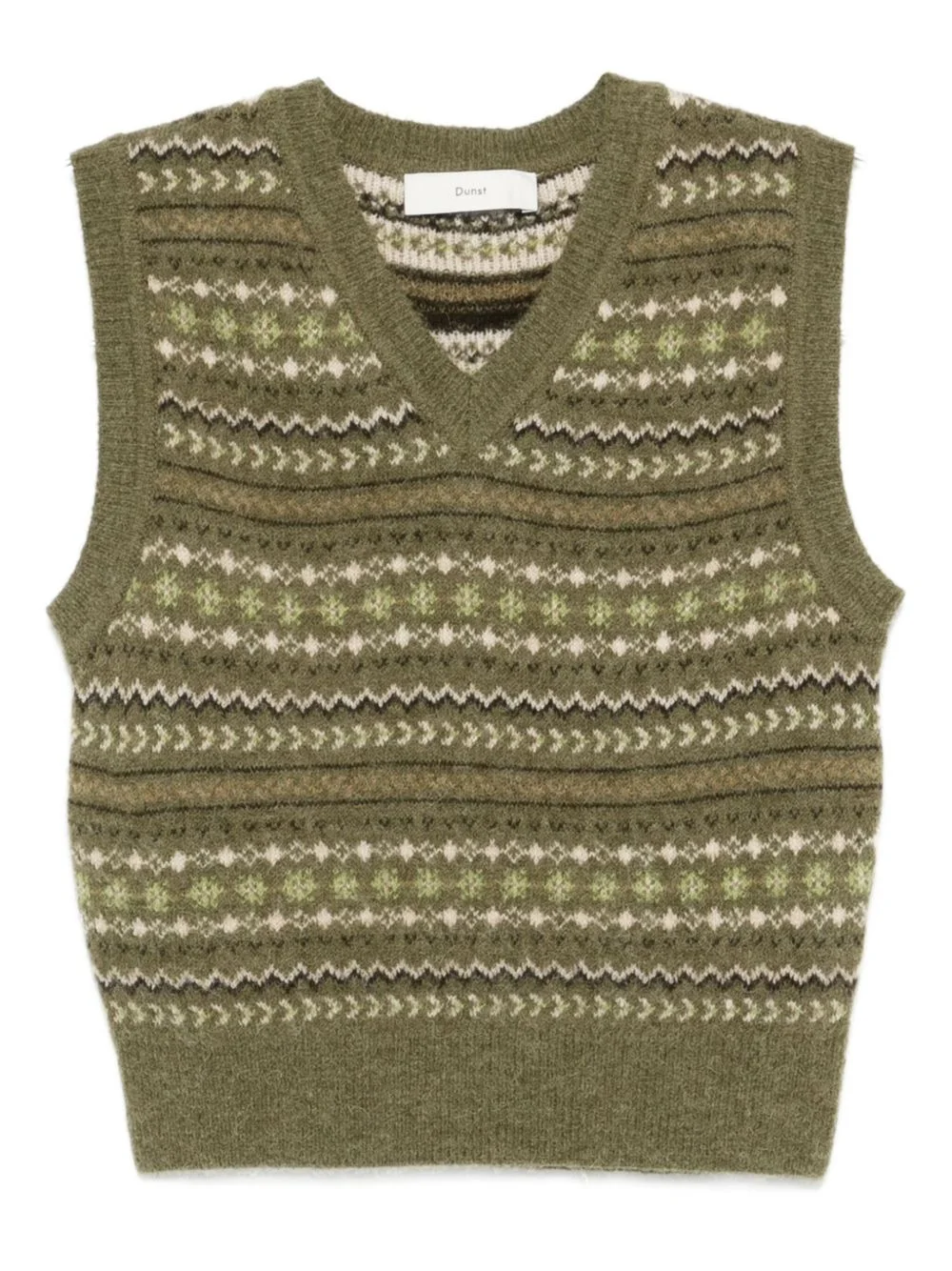 V-neck sleeveless sweater Highlights - Olive green - V-neck - Sleeveless - Ribbed hem Imported Composition Acrylic 50%, Nylon 32%, Wool 15%, Polyurethane 3% Washing instructions Dry Clean Only