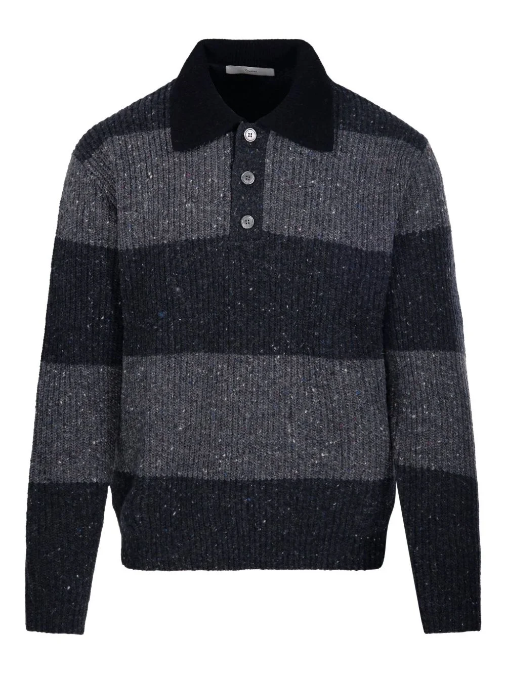 striped knitted polo shirt Highlights - Grey - Stripe pattern - Front button placket - Polo collar - Long sleeves - Ribbed knit Imported Composition Wool 50%, Polyester 25%, Nylon 25% Washing instructions Read Manufacturer Guidelines