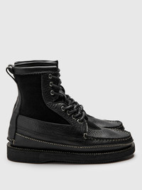Named after the picturesque region of Rangeley, Maine, Easymoc's Rangeley silhouette reimagines the classic Logger boot, complete with hand-sewn detailing and fully resolable Blake stitch construction. Produced in small batches, this installment features a combination of the brand's signature Grizzly pebbled leather and North American Mole Suede. The boots are finished with an Ortholite® Comfort footbed, Vibram® 2062 Morflex rubber outsole, and leather cord laces. Proudly crafted in the USA. - Hand-sewn construction - Black Grizzly cowhide leather - Black North American suede - Blake stitched - Ortholite® comfort hybrid recycled footbed - Recycled mesh footbed cover - Leather cord laces - Metal eyelets - Vibram® 2062 Morflex sole - Fully resolable - Made in Maine, USA