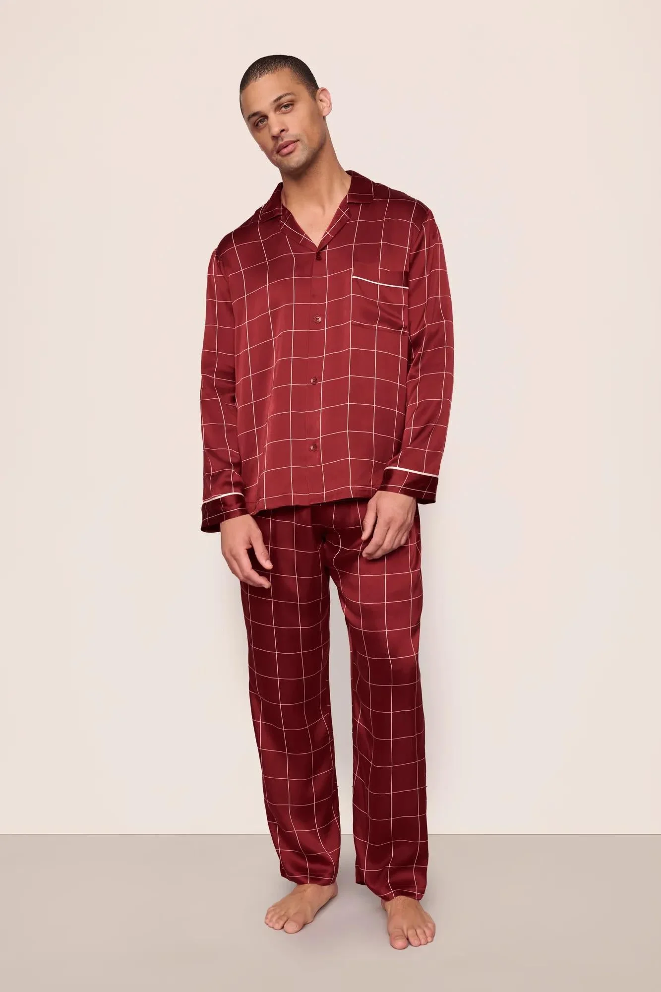 In collaboration with supermodel and entrepreneur Lily Aldridge, this limited-edition collection pairs our signature Washable Silk with Lily’s modern, sophisticated eye. Designed for luxe, intimate moments to match with your other half. Made from 100% mulberry silk, produced using bluesign®-certified processes and verified by OEKO-TEX® Standard 100, meaning our fabric is processed without harmful chemicals and dyes in a mill that uses safe and non-toxic dyes. This machine-washable set includes a long sleeve button-down top with a notch collar and chest pocket, straight leg pants with an elastic waistband and adjustable drawstring, side seam pockets, and functional patch pockets for a relaxed fit that's perfect for nightly wear. Make it a matching moment with the Inez Long Washable Silk Set in Plaid. Color: Simple Plaid Merlot/Ivory DESIGN & FIT - Button front, classic fit top - Elastic waistband pant with adjustable drawstring tie - Classic fit — true to size; recommend sizing up for more relaxed fit FABRIC & CARE - Fabric: 100% Machine Washable Silk — luxuriously soft and lightweight - Care: Hand wash or machine wash cold on delicate cycle, separately. Remove promptly and lay flat to dry. Do not bleach. Mesh washbag recommended. - Imported