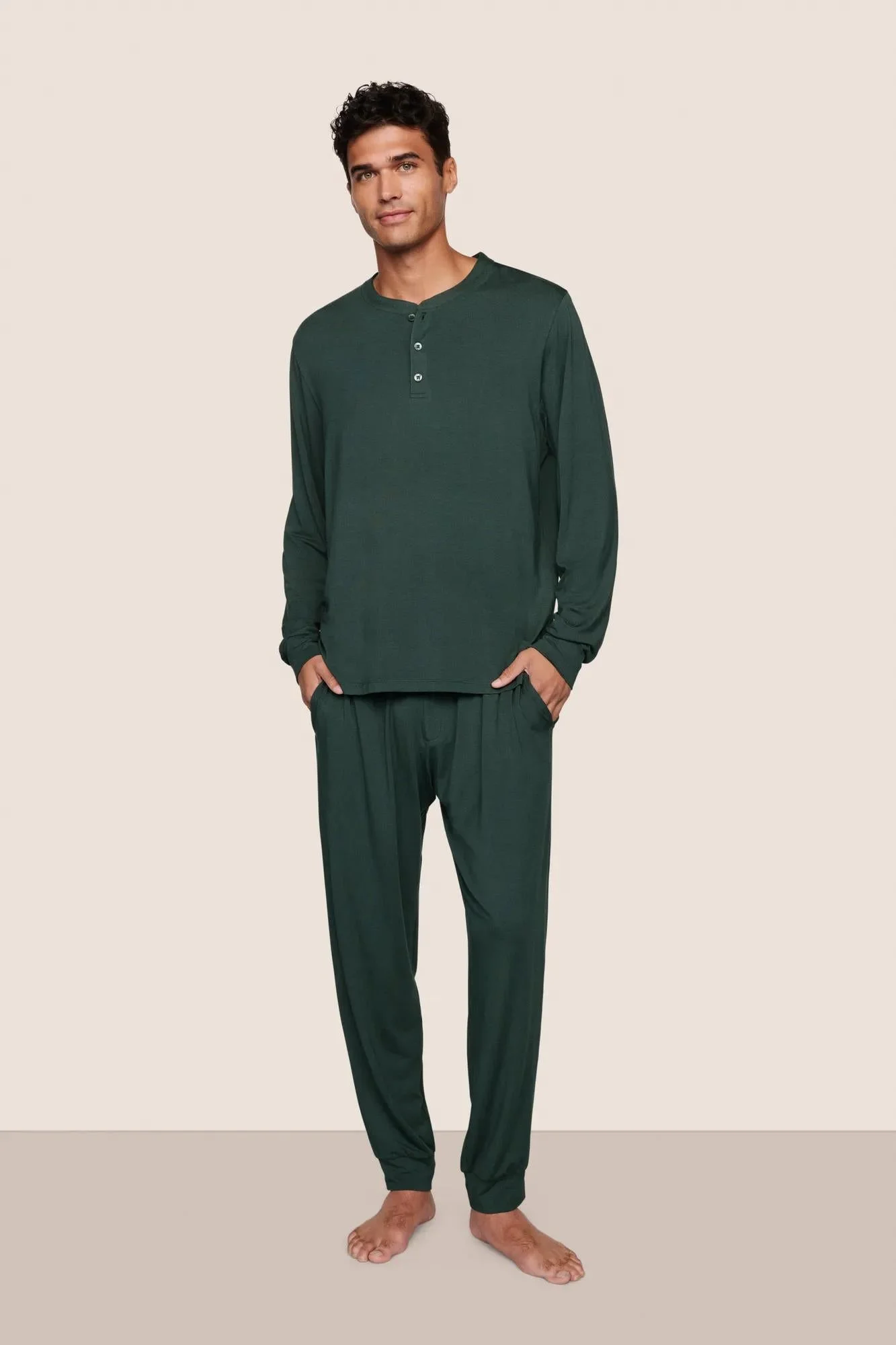 Give him a good night’s sleep, every night. Made from TENCEL™ Modal fibers and a touch of elastane, this temperature-regulating knit fabric is verified by OEKO-TEX® Standard 100, meaning it’s dyed with safe and non-toxic dyes. The relaxed-fit Henley long sleeve top has functional buttons at the neckline, while the pant features an elastic waistband, adjustable drawstring, faux fly, and functional pockets for added comfort. Color: Pine DESIGN & FIT - Henley-style long sleeve top with button detail - Elastic waistband with adjustable drawstring tie and functional pockets - Relaxed Fit — roomy, easy silhouette for effortless comfort FABRIC & CARE - Fabric: 95% TENCEL™ Modal, 5% Elastane — ultra-soft, breathable, and naturally drapes for all-day comfort. - Turn inside out before washing. Machine wash cold with like colors on a gentle cycle. Use only non-chlorine bleach when needed. Tumble dry low. Warm iron if necessary. - Imported.