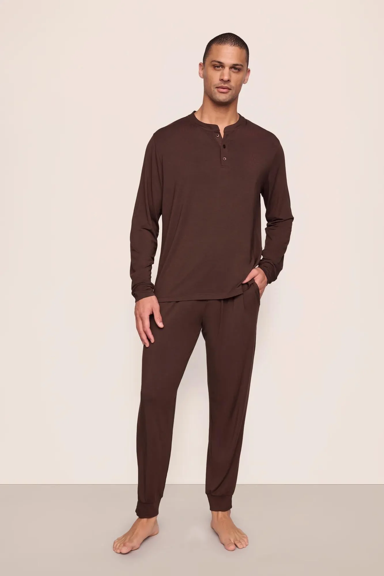 Give him a good night’s sleep, every night. Made from TENCEL™ Modal fibers and a touch of elastane, this temperature-regulating knit fabric is verified by OEKO-TEX® Standard 100, meaning it’s dyed with safe and non-toxic dyes. The relaxed-fit Henley long sleeve top has functional buttons at the neckline, while the pant features an elastic waistband, adjustable drawstring, faux fly, and functional pockets for added comfort. Color: Chocolate DESIGN & FIT - Henley-style long sleeve top with button detail - Elastic waistband with adjustable drawstring tie and functional pockets - Relaxed Fit — roomy, easy silhouette for effortless comfort FABRIC & CARE - Fabric: 95% TENCEL™ Modal, 5% Elastane — ultra-soft, breathable, and naturally drapes for all-day comfort. - Turn inside out before washing. Machine wash cold with like colors on a gentle cycle. Use only non-chlorine bleach when needed. Tumble dry low. Warm iron if necessary. - Imported.