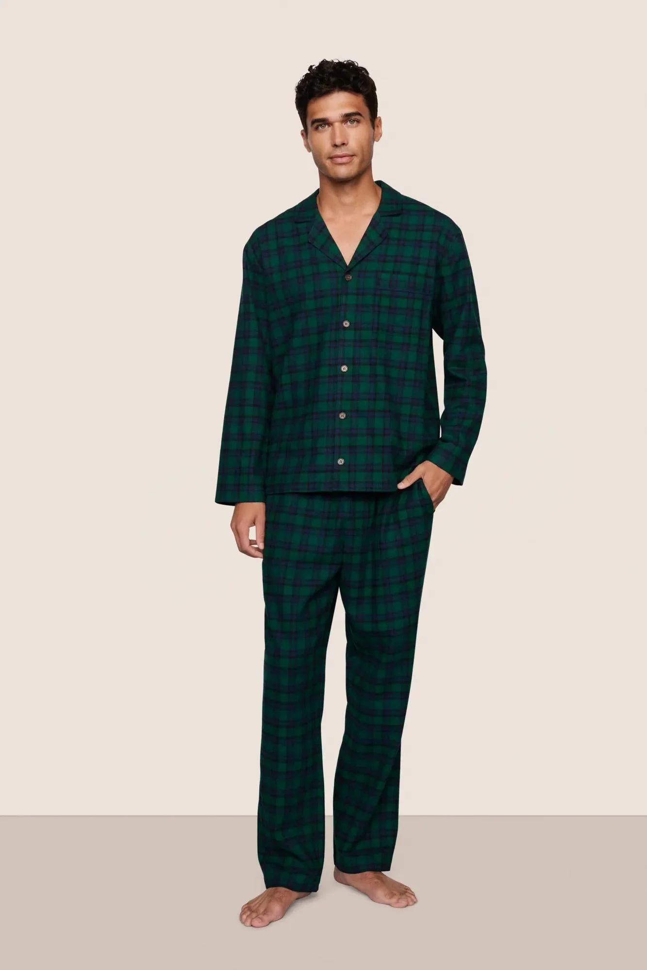 If cozy had a print, this would be it. Crafted from 100% cotton, our flannel is brushed to ensure a super soft feel against the skin, making it easy to wear and hard to take off. Great for classic holiday looks and cabin getaways, this relaxed long sleeve and pant set features a button-down top with a notch collar and functional chest pocket, adding a touch of sophistication to your nighttime routine. The mid-rise straight leg pant offers an everyday fit with its elastic waistband and side pockets. Complete with faux horn buttons and contrast piping on the chest pocket, these PJs are the perfect mix of cozy and stylish. Color: Black Watch Tartan Rainforest/Navy DESIGN & FIT - Button-down long sleeve top with notch collar and chest pocket - Mid-rise straight leg pant with elastic waistband and pockets - Classic Fit — true to size, comfortable for everyday wear FABRIC & CARE - 100% Cotton, brushed for softness - Machine wash cold, delicate cycle; hang dry - Imported