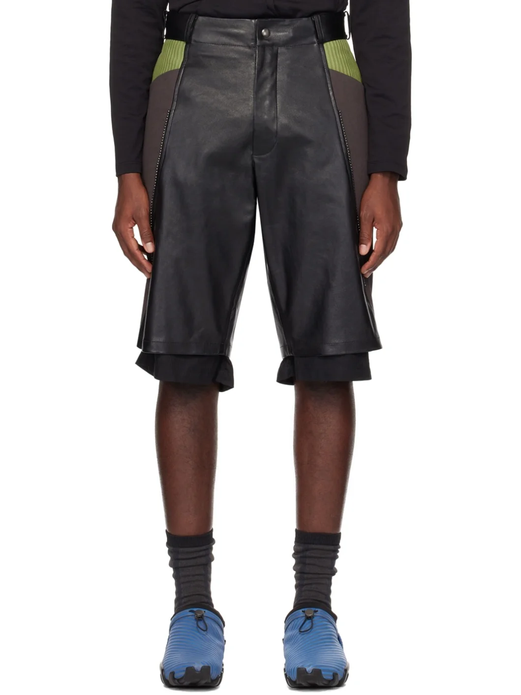 Buffed leather and cotton twill shorts. · Paneled construction · Belt loops · Stripe-embossed nubuck trim at waist · Four-pocket styling · Zip-fly · Studs at front · Inset seersucker cuffs · Full cotton seersucker lining Part of the ECCO.kollektive x Kiko Kostadinov collaboration. Supplier color: Black/Turtle green Body 1: 100% leather. Body 2: 100% cotton. Lining: 100% cotton. Made in Turkey 241953M193001