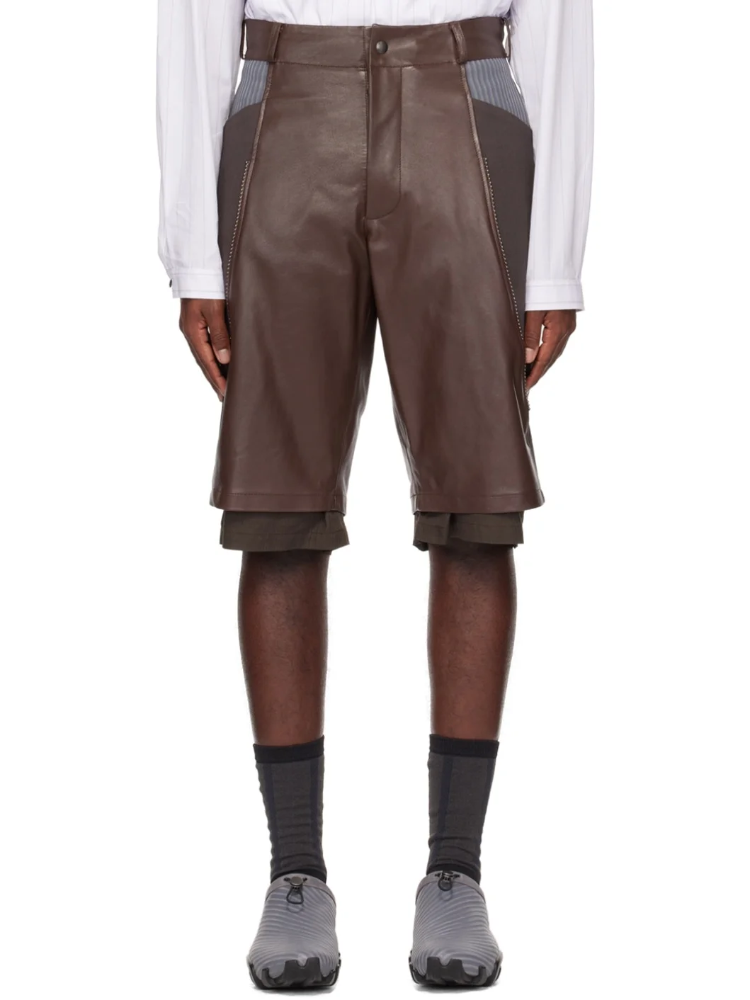 Buffed leather and cotton twill shorts. · Paneled construction · Belt loops · Stripe-embossed nubuck trim at waist · Four-pocket styling · Zip-fly · Studs at front · Inset seersucker cuffs · Full cotton seersucker lining Part of the ECCO.kollektive x Kiko Kostadinov collaboration. Supplier color: Chicory coffee/Steel Body 1: 100% leather. Body 2: 100% cotton. Lining: 100% cotton. Made in Turkey 241953M193000