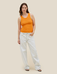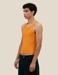 Slim-fitting tank in dry fine-gauge 1x1 cotton rib, featuring a red hand-embroidered "EL" logo on the left abdomen. Models wear sizes Medium and Small 77% COTTON 23% NYLON Produced in Japan