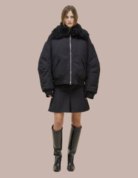 Crafted from Italian nylon with a shearling collar and knit trim at the cuffs and hem. Featuring a natural fit with a rounded silhouette, zip front closure with a two-way metal zipper, and two flap front pockets with hidden snaps. XS: 49CM CHEST, 54.5CM SHOULDER WIDTH, 59CM SLEEVE LENGTH, 62CM BODY LENGTH, APPROX 40CM (ELASTIC) HIP WIDTH S: 50CM CHEST, 57CM SHOULDER WIDTH, 61CM SLEEVE LENGTH, 64CM BODY LENGTH, APPROX 44CM (ELASTIC) HIP WIDTH M: 53CM CHEST, 59.5CM SHOULDER WIDTH, 63CM SLEEVE LENGTH, 66CM BODY LENGTH, APPROX 48CM (ELASTIC) HIP WIDTH L: 56CM CHEST, 62CM SHOULDER WIDTH, 65CM SLEEVE LENGTH, 68CM BODY LENGTH, APPROX 52CM (ELASTIC) HIP WIDTH XL: 59CM CHEST, 64.5CM SHOULDER WIDTH, 67CM SLEEVE LENGTH, 70CM BODY LENGTH, APPROX 56CM (ELASTIC) HIP WIDTH Sarah is 5'10" and wears size medium, Mitchel is 6'2" and wears size medium SHELL: 51% RECYCLED NYLON 49% NYLON COLLAR: 100% SHEARLING LINING: 100% ACETATE Produced in China.