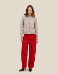 Slim-fitting hooded zip-up in an extrafine merino-cotton blend with Donegal speckled yarn, featuring double-faced knit construction, accent color side-seam stripe detail, and rib trim. Models wear size medium 62% EXTRAFINE MERINO 38% COTTON CHINA