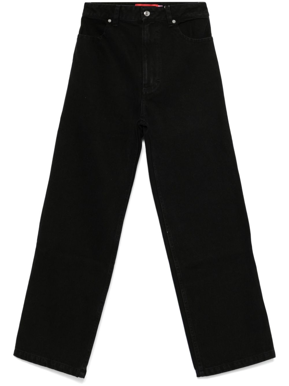 wide-leg jeans Cut from structured cotton that accentuates their wide-leg silhouette, these Eckhaus Latta jeans are designed with a versatile tonal black colourway. The pair sits high at the waist and fastens with a button and zip closure. Highlights - Black - Cotton - Denim - Front button and zip fastening - Belt loops - Two diagonal pockets to the sides - Two rear patch pockets - Wide leg - When buying this unisex item, keep in mind that it is graded in standard men's sizing. Imported Composition Cotton 100%