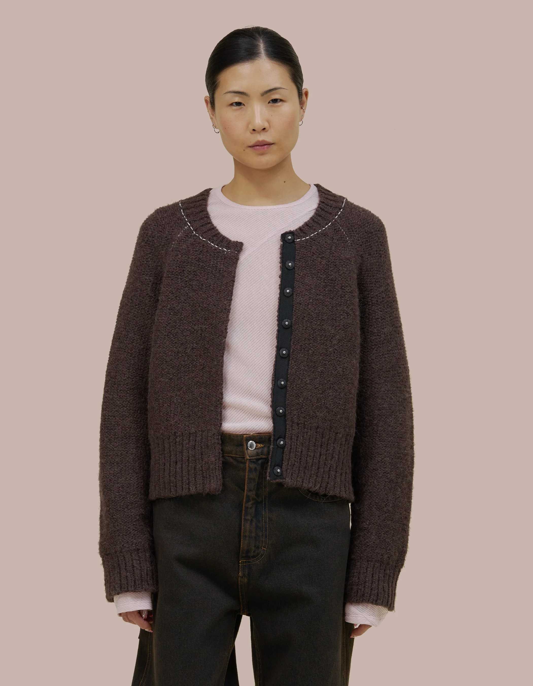 Easy fitting bomber shape jacket in a twisted alpaca/wool boucle yarn. Features an invisible hand sewn metal snap closure and grosgrain placket at front. Jacket is linked together with a contrast yarn. XS: 48.3CM LENGTH, 43.2CM CHEST, 69.9CM SLEEVE, 38.1CM BOTTOMS: 50.2CM LENGTH, 45.7CM CHEST, 72.4CM SLEEVE, 40.6CM BOTTOMM: 52.1CM LENGTH, 48.3CM CHEST, 74.9CM SLEEVE, 43.2CM BOTTOML: 53.9CM LENGTH, 50.8CM CHEST, 77.5CM SLEEVE, 45.7CM BOTTOMXL: 55.9CM LENGTH, 53.3CM CHEST, 80.0CM SLEEVE, 48.3CM BOTTOM