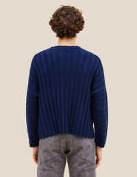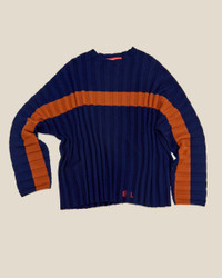 Oversized crewneck sweater in 10x10 merino wool rib, featuring dolman sleeves, a tonal wide rib stripe, and an intarsia-knit red EL logo. Models wear sizes small and medium 100% EXTRAFINE MERINO WOOL CHINA
