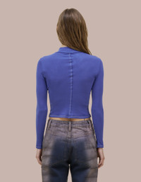 Our classic lapped baby turtleneck in a 1x1 cotton baby rib. Fitted, slightly cropped. Topstitched raw edged seams create form-flattering vertical and horizontal lines across the body. Marine blue garment dye with pale pink contrast. Finished with screenprinted pink logo on abdomen. XS: 48CM FRONT LENGTH, 45CM BACK LENGTH, 34CM CHEST WIDTH, 27CM SHOULDER WIDTH, 71CM SLEEVE LENGTH, 32CM BOTTOM WIDTH S: 49CM FRONT LENGTH, 46.5CM BACK LENGTH, 36CM CHEST WIDTH, 29CM SHOULDER WIDTH, 72.5CM SLEEVE LENGTH, 34CM BOTTOM WIDTH M: 51CM FRONT LENGTH, 48CM BACK LENGTH, 37.5CM CHEST WIDTH, 30CM SHOULDER WIDTH, 73.5CM SLEEVE LENGTH, 36CM BOTTOM WIDTH L: 52.5CM FRONT LENGTH, 49.5CM BACK LENGTH, 39.5CM CHEST WIDTH, 31CM SHOULDER WIDTH, 75CM SLEEVE LENGTH, 38CM BOTTOM WIDTH XL: 54CM FRONT LENGTH, 51CM BACK LENGTH, 41.5CM CHEST WIDTH, 32.5CM SHOULDER WIDTH, 76CM SLEEVE LENGTH, 40CM BOTTOM WIDTH Sarah is 5'10.5 and wears. a size small 100% Cotton Produced in Peru.