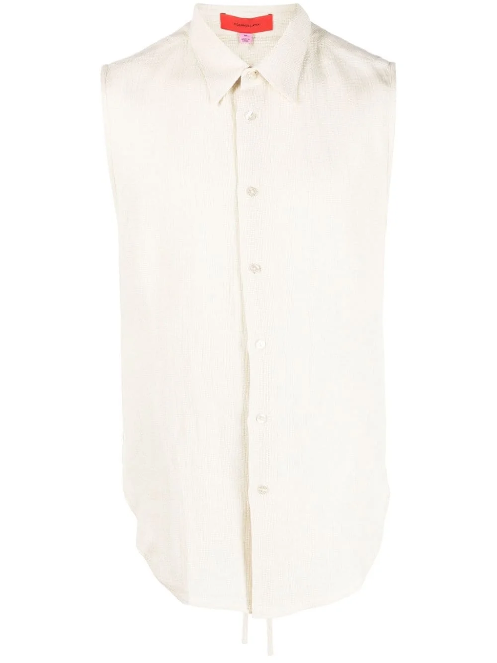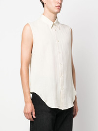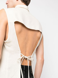 open-back sleeveless shirt Highlights - Cream white - Cotton-linen blend - Open back - Classic collar - Front button fastening - Rear tie fastening - Sleeveless - Curved hem - When buying this unisex item, keep in mind that it is graded in standard men's sizing. Imported Composition Cotton 54%, Linen/Flax 46% SIZE & FIT Model measurements Height 5 ft 10 in(1.79 m) Bust/Chest 33.07 in(84 cm) Hips 35.82 in(91 cm) Waist 24.01 in(61 cm) FittingInformation This unisex piece is designed for a slim fit whether you usually select women's or men's sizes The tie fastening gives an adaptable and personalised fit Made from a midweight non-stretch fabric Washing instructions Hand Wash