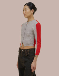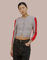 Button front cardigan with a cropped shrunken fit. Featuring colorblocking and speckled donegal details throughout, finished with Eckhaus Latta logo buttons. XS: 36.2CM CHEST, 43.2CM FRONT LENGTH, 61CM SLEEVE LENGTH S: 38.7CM CHEST, 45CM FRONT LENGTH, 63.5CM SLEEVE LENGTH M: 41.3CM CHEST, 47CM FRONT LENGTH, 66CM SLEEVE LENGTH L: 43.8CM CHEST, 48.9CM FRONT LENGTH, 68.5CM SLEEVE LENGTH XL: 46.4CM CHEST, 50.8CM FRONT LENGTH, 71CM SLEEVE LENGTH May is 5'10 and wears size small. 100% EXTRAFINE MERINO Produced in China.