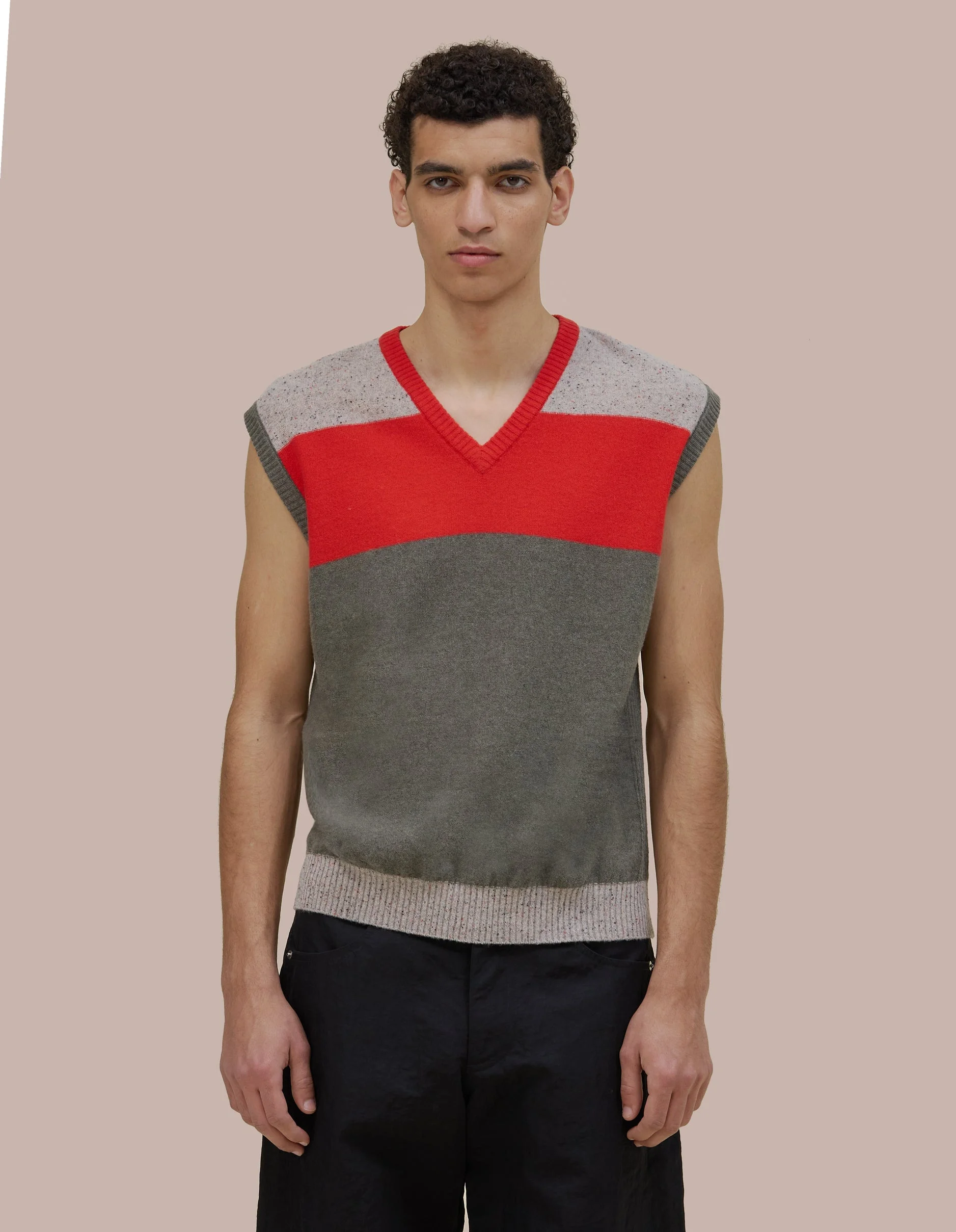 V neck vest with a boxy, oversized fit. Features colorblocking and donegal speckled details throughout. Hazem is 6'1 and wears a size medium, May is 5'10 and wears a size medium. 100% EXTRAFINE MERINO Produced in China.