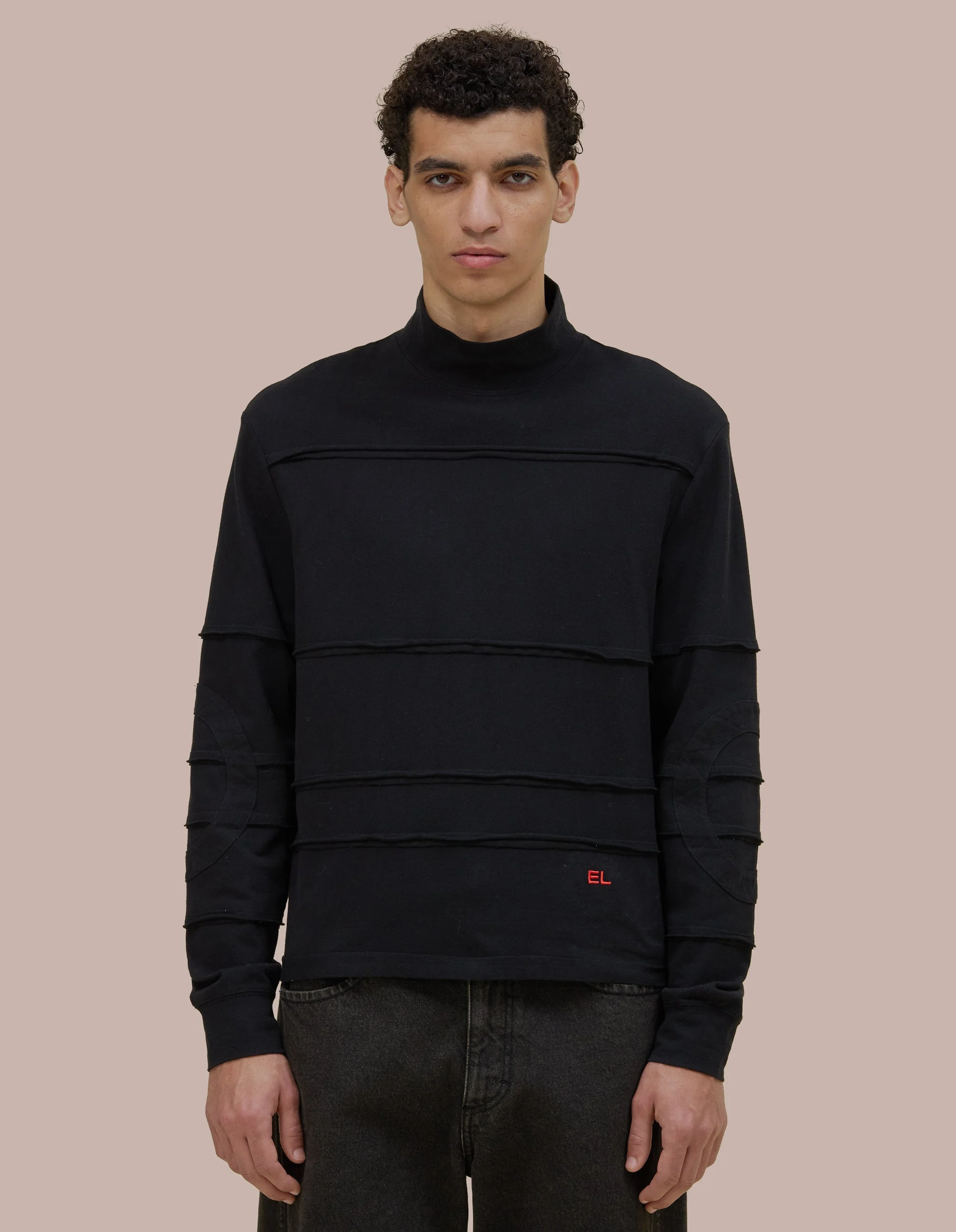 A relaxed-fit long sleeve turtleneck with a two way metal zipper along the center back. Stripes are assembled from individual strips, finished externally to echo our signature lapped seams. Red "EL" logo embroidery at the lower left abdomen. XS: 19.5 chest width, 24.5 front length, 7 neck width S: 20.5 chest width, 25.12 front length 7.25 neck width M: 21.5 chest width, 25.75 front length, 7.5 neck width L: 22.5 chest width, 26.37 front length, 7.75 neck width XL: 23.5 chest width, 27 front length, 8 neck width Hasem is 6'1" and wears a size M 100% Cotton Produced in China