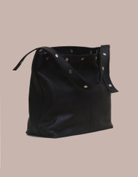 Available now for pre order, this bag will ship mid October. Expanding on the world of The Snap, The Bucket offers a more utilitarian approach. This spacious bag easily fits a laptop, book, and water bottle with room to spare. The straps snap together, allowing the user to adjust the handle drop between 7 inches and 51 inches, easily transforming from shoulder bag to cross body bag. Made in vegetable dyed Italian lambskin with a debossed logo and custom logo snaps. Internal zip pocket. H14” x W14” x D6.5” Material: Italian lambskin Produced in China